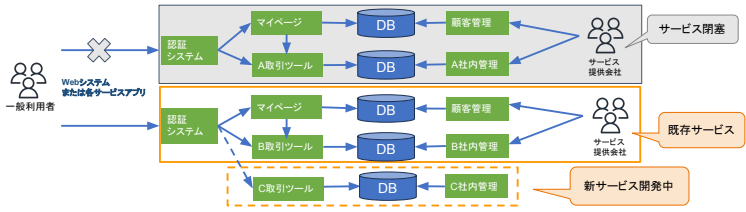 対象となったのは、顧客管理・認証システムを中心とし、複数の取引ツール(A・B・C)やデータベースが連携する大規模なシステム群です。
